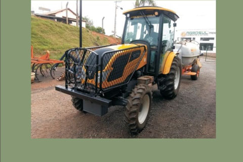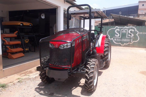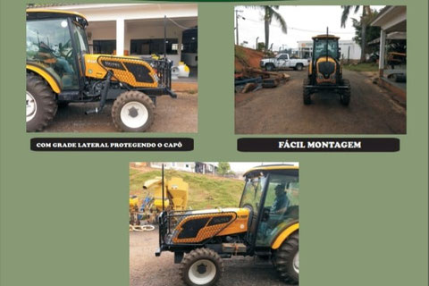 Montado em material reforçado com grades laterais que protegem o capô. Designer apropriado acompanhando o formato original da frente do trator. De fácil remoção para eventuais manutenções.