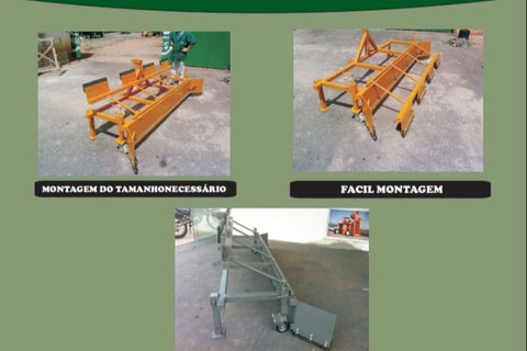 Largura total do amontoador 2,50m x 2 abas de 0,30cm. Altura da lâmina 0,35cm. Rodas de apoio giratórias. Peso aproximado 400kg.